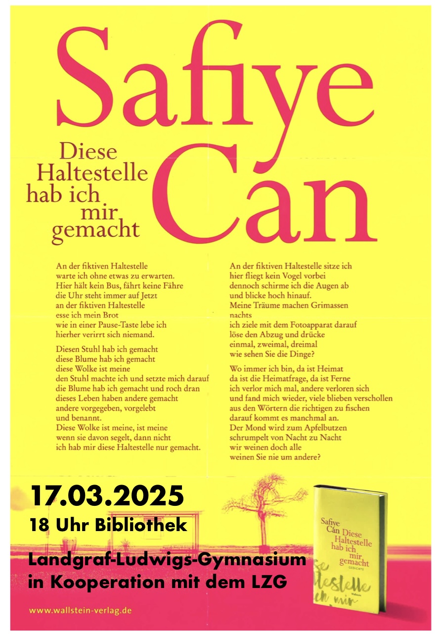 Safiye Can ist 1977 in Offenbach geboren und aufgewachsen. Die Dichterin der konkreten und visuellen Poesie hat tscherkessische Vorfahren. Sie studierte Philosophie, Psychoanalyse und Rechtswissenschaft an der Johann Wolfgang Goethe-Universität Frankfurt am Main und debütierte 2014 mit ihrem Gedichtband „Rose und Nachtigall“. Eine Veranstaltung des Landgraf-Ludwigs-Gymnasiums in Kooperation mit dem Literarischen Zentrum Gießen. Der Eintritt ist kostenlos und barrierefrei!